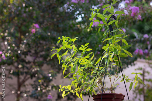 Vase of edible lemon or bee balm in the backyard of the modern house. Healthy lifestyle.