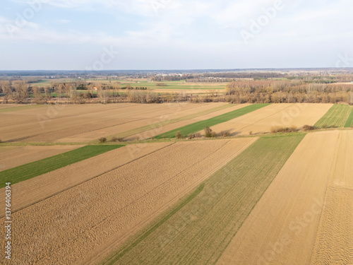 Vast agricultural fields with varying shades of green and brown stretch across the landscape, showcasing farmland under a bright sky in early spring.