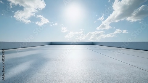Vast calm water reflecting blue sky, white clouds, and bright sun in minimalist composition.