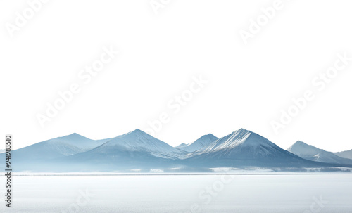 Vast empty snowy frozen winter landscape with mountain range in the distant horizon. Isolated transparent background PNG. Frozen lake.