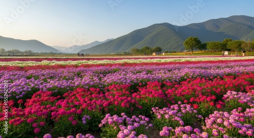 Vast expanse of colorful flowers blooming under clear blue sky with distant mountains