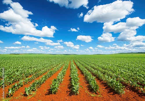 Vast Green Cornfield Under Blue Sky with Fluffy Clouds and Bright Sunshine Displaying Healthy Agricultural Growth and Natural Beauty of Farming Landscapes