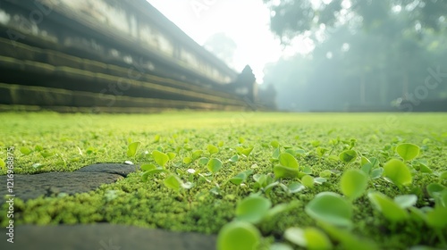 Vast green field of grass stretching to the horizon under a clear blue sky lush