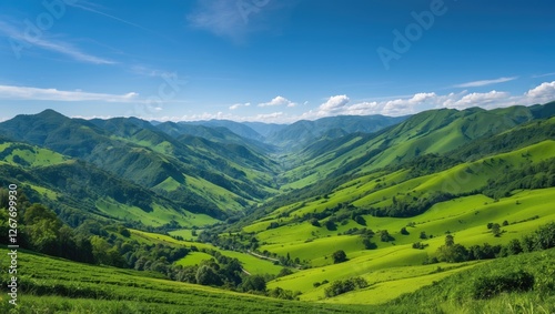 Vast green valley landscape with rolling mountains under clear blue sky and fluffy white clouds in day light Copy Space