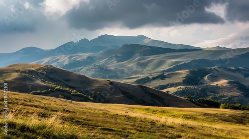 Vast Mountain Landscape Under Cloudy Sky With Golden Sunlight and Green Hills