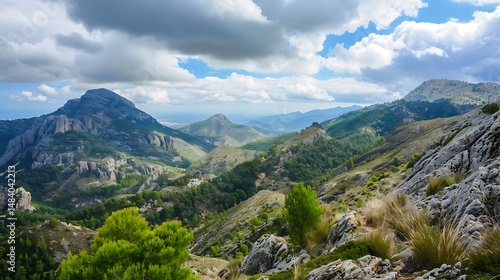 mountain, landscape, nature, scenic, green, sky, cloud, vale, tree, outdoors, hill, view, panorama, peak, rocky, vegetation, day, summer, tour tourism, travel, environment, beautiful, wilderness, elevation, horizon, ecology, flora, forest, natural, land, atmosphere, up high, bright, sunshine, range, huge, majestic, stone, cliff, peak, hiking, journey, tranquil, blue, white, high, wide, explore, discovery