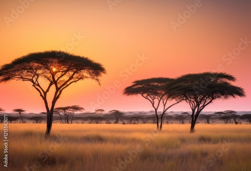 vast tranquil landscape grassy savannah adorned iconic acacia trees under radiant sky, grassland, biodiversity, horizon, cloud, formations, ecosystem