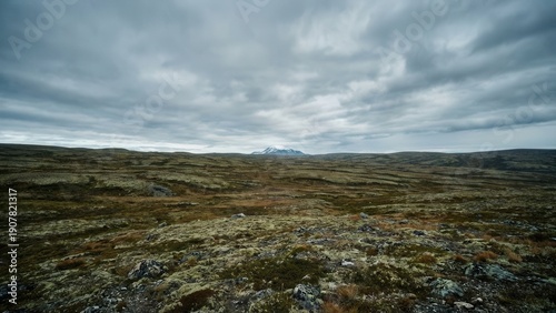 Vast, Undulating Tundra Landscape Under a Moody, Overcast Sky with Distant Mountains