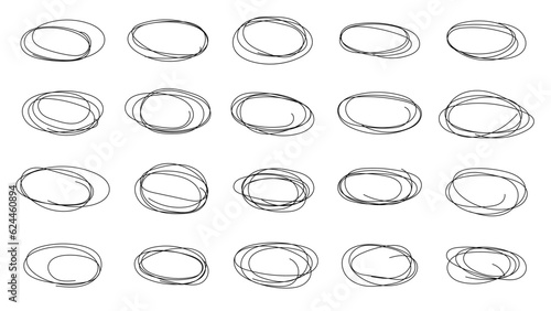 Vector abstract hand drawn pencil set scribble ellipses and ovals on white background. Abstract grunge frames and borders elements. Doodle sketched highlight circles or rings. Pen hand drawing.