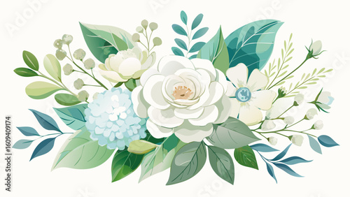 Vector art of a delightful watercolor floral display with white roses, soft blue flowers, and fresh green leaves