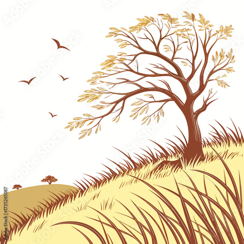 tree, hill, grass, bird, sky, landscape, nature, season, tree branch, leaf, wind, autumn, rural, countryside, scenery, environment, day, sun, field, meadow, plant, drawing, artwork, graphic, design, element, art, view, scene, calm, peaceful, serene, tranquil, beauty, silhouette, wildlife, flight, freedom, horizon, distance, farm, pasture, slope, flora, growth