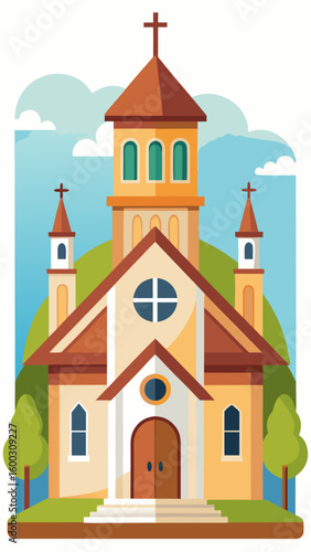 Vector art of a vibrant flat illustration showcases a quaint church with a central cross a bell tower and inviting double doors nestled amidst rolling green hills and