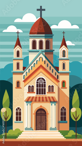Vector art of an artistic flatdesign depiction of a grand church featuring multiple towers a prominent dome and a welcoming entrance with stairs set against a
