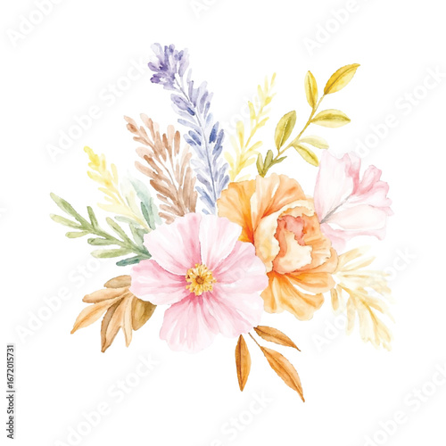 Vector art of beautiful watercolor floral arrangement featuring delicate pink and orange blossoms, soft green leaves, and wispy lavender sprigs