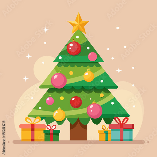 Vector art of christmas tree with ornaments and gifts for holiday season celebration