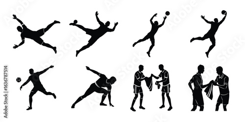 Vector art of collection of diverse soccer and football player silhouettes in dynamic action poses, isolated on a white background