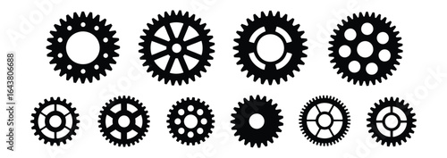 Vector art of collection of gear and cog wheel icons isolated on white background, representing mechanical and engineering concepts, perfect for illustrating technology and industrial processes