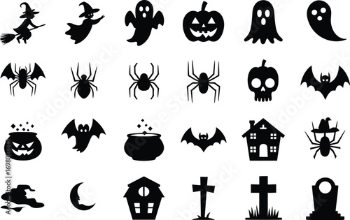 Vector art of collection of halloween themed silhouettes, featuring witches, ghosts, pumpkins, spiders, bats, and spooky houses for festive designs