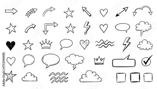 arrow, star, nubes, cloud, speech, bubble, crown, lightning, bolt, wave, checkmark, tick, box, square, drawing, vignetting, doodle, hand-drawn, symbol, element, design, graphic, set, collection, group, many, various, different, simple, basic, outline, black, clip art, art, creative, concept, idea, communication, shape, form, style, modern, minimalist