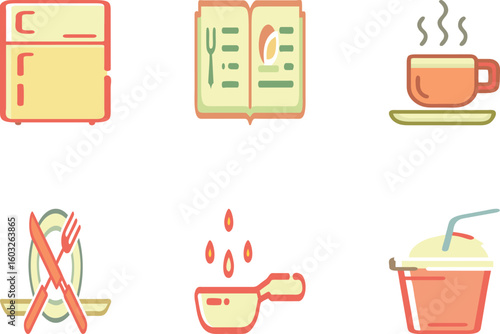 food, kitchen, eatery, cooking, dining, set, collection, graphic, design, flat, style, refrigerator, refrigerator, appliance, cookbook, receipe, book, menu, hot drink, cup, hot, drink, beverage, cutlery, fork, knife, plate, meal, eating, straw, smoothie, juice, liquid, steam, isolated, white, background, simple, modern, clip art, symbol, element, theme