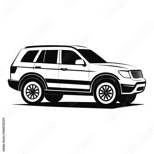 Vector art of detailed black and white vector illustration of a modern suv from a side profile, isolated on a