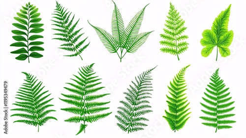 vector art of fern fronds from various fern species, each showcasing detailed veins and elegant curves, set against a white background. [Fern leaves]:[isolate on white background.Illustrations]