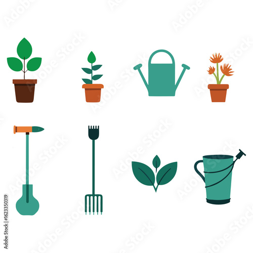 Vector art of gardening tools and plants set isolated on white background, featuring pots, watering cans, and gardening implements