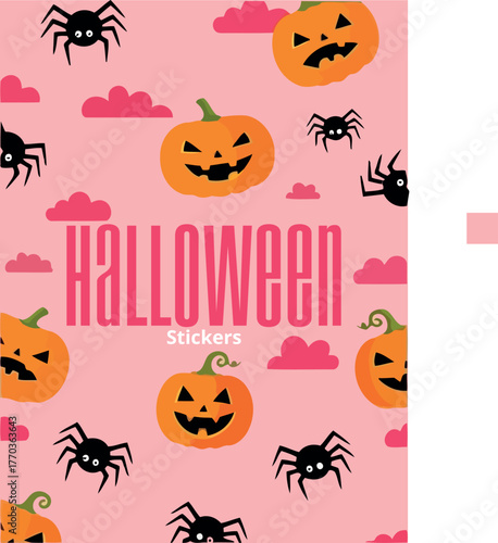 Vector art of halloween pumpkins and spiders on a pink background with text