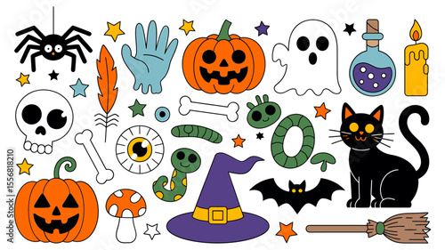 halloween, skittish, pumpkin, ghost, cat, bat, sorcerer, spider, potion, skull, candle, eye, hand, broom, bone, worm, mushroom, star, hat, black, orange, purple, green, yellow, white, cute, holiday, autumn, season, celebration, design, clip art, drawing, illustration, graphic, element, symbol, icon, sticker, isolated, decoration, vector, cartoon, set