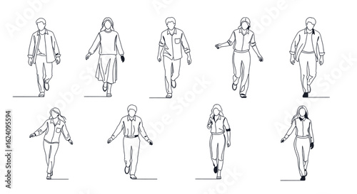 Vector art of set of simple line drawings of people walking and standing, isolated on white background