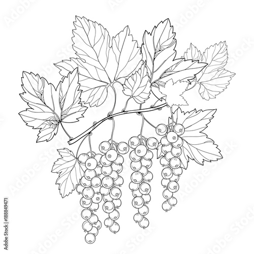Vector branch with outline Red currant berry and leaves in black isolated on white background. Floral elements with redcurrant fruit bunch in contour style for summer design and coloring book.