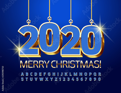 Vector bright Greeting Card Merry Christmas with decorative toys. Shiny Gold and Blue Font. Elegant Alphabet Letters and Numbers
