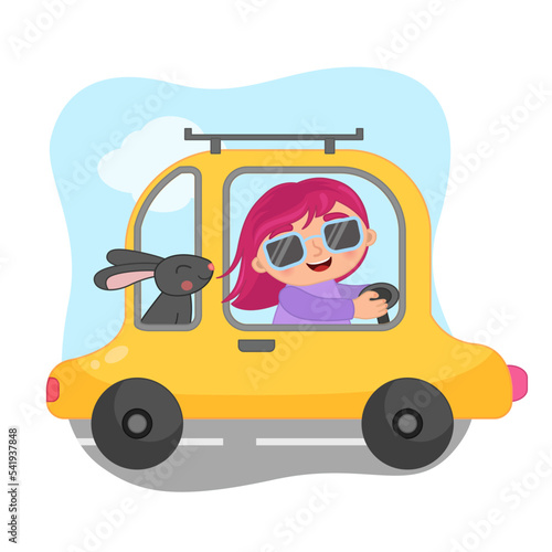 Vector cartoon illustration of a cute girl riding a yellow car along with a gray rabbit.