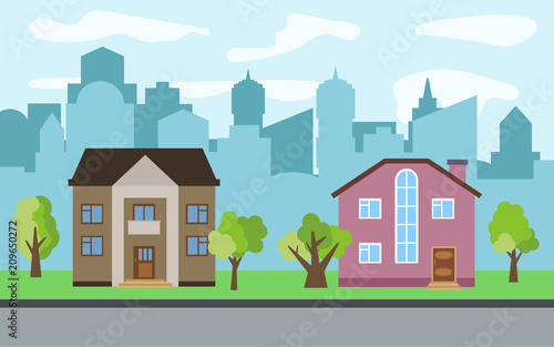 Vector city with two two-story cartoon houses and green trees in the sunny day. Summer urban landscape. Street view with cityscape on a background
