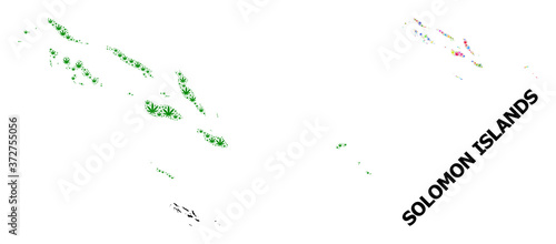 Vector Collage Map of Solomon Islands of Bright and Green Hemp Leaves and Solid Map