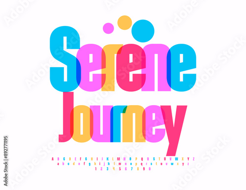 Vector colorful flyer Serene Journey. Creative Bright Font. Artistic Alphabet Letters and Numbers set.