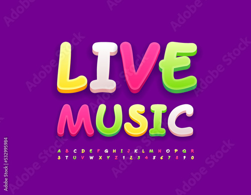 Vector colorful logotype Live Music. Modern creative Font. Bright funny Alphabet Letter and Numbers
