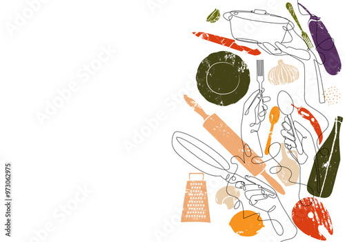 Vector culinary artwork. Continuous line drawing illustration of hands holding utensils and grunge silhouettes of cutlery and various ingredients. Homemade food. Cooking graphic design element.