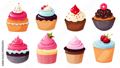 cupcake, cupcake, sweet, dessert, pastry, cake, frosting, icing, whipped cream, cherry, donut, chocolate, vanilla, strawberry, blueberry, sprinkle, candy, bakery, baking, cartoon, cute, colourful, pink, blue, red, brown, vector, illustration, food, birthday, celebration, party, deliciously, delicious, treat, epicure, baked, sugar, glaze, topping, muffin, sweet food, confectionery, isolated, digital artwork, children, pastel, decoration, tasty