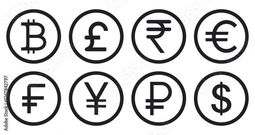 currency, signs, earning, minimalist, exchange, minimal, number, japan, payment, commerce, economy, japanese, banking, outline, pay, sterling, round, line, background, finance, money, graphic, america, simple, monetary, british, dollar, pound, yen, vector, circle, russian, ruble, icon, rupee, coin, euro, illustration, business, thin, set, white, digital, clean, symbol, token, black, design, price
