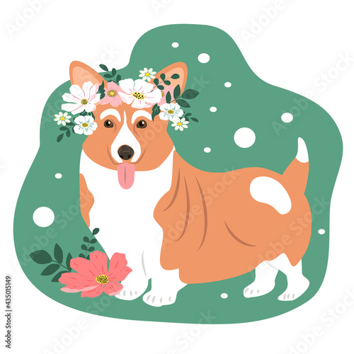 vector cute hand drawn illustration - corgi dog in a wreath of summer flowers. trendy illustration in flat style for websites, magazines and apps