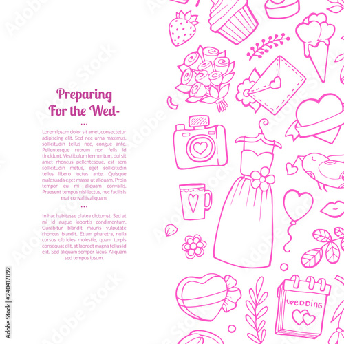 Vector doodle wedding elements background with place for text illustration. Holiday banner wedding, calendar and camera, dress and envelope