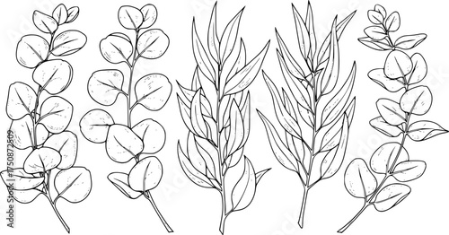 eucalyptus, tree branch, leaf, vignetting, foliage, vector, illustration, hand-drawn, vintage, wedding, elegant, tree, collection, monochrome, aroma, rustic, spring, greenery, engraving, herbal, background, romantic, wild, isolated, detail, nature, plant, line, design, flower, herb, decorative, different, natural, element, art, summer, decoration, drawn, white, black, drawing, botanical, graphic, set, floral