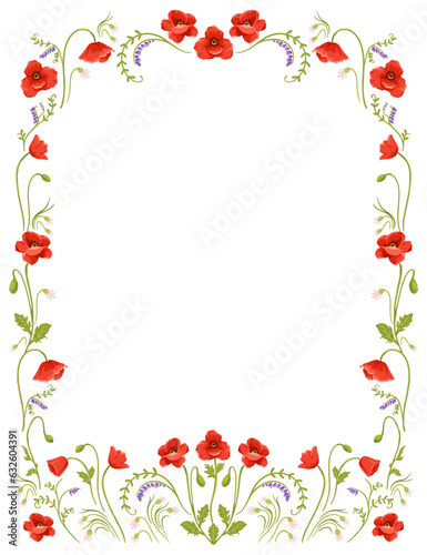 poppy, red, frame, illustration, vector, floral, flower, wildflower, bud, bloom, blossom, plant, nature, summer, leaf, green, stem, flower petals, beauty, beautiful, hand-drawn, detailed, botanical, garden, flower, border, leaf, card, decoration, design, spring, art, chaplet, holiday, ornament, invitation, wedding, greeting