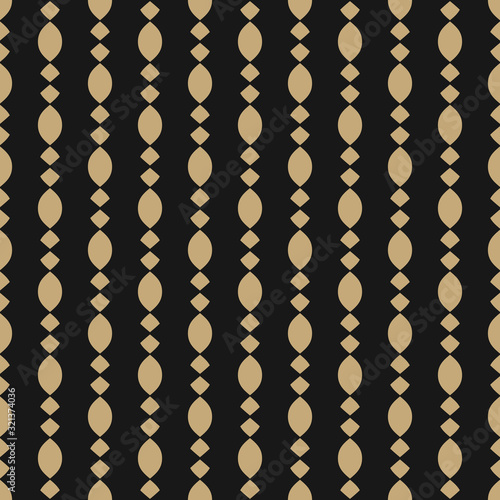 Vector golden linear seamless pattern with chains, beads, ovals, diamond shapes, vertical bands. Stylish black and gold abstract background. Luxury ornamental texture. Repeat design for decor, covers