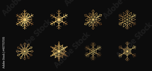 Vector golden snowflakes on the black background. Isolated outline flakes set. Gold collection for winter decor.