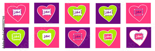 Vector hearty set. Hand drawn isolated purple, bright pink and green hearts in outline with patch sewn thread and word "Love" on white background for design.