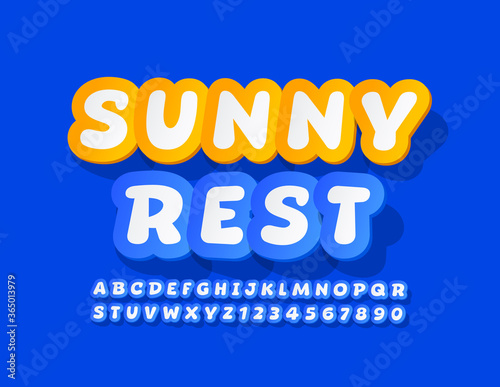 Vector holiday logo Sunny Rest. Creative sticker Font. Blue and White Alphabet Letters and Numbers