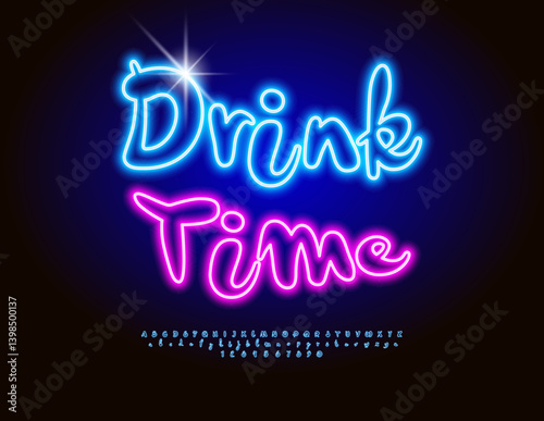 Vector Holiday poster Drink Time. Neon Blue Font. Joyful Glowing Alphabet Letters and Numbers set.