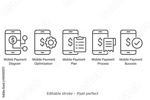 Vector icon set illustrating mobile payment concepts including diagram, optimization, plan, process, and success